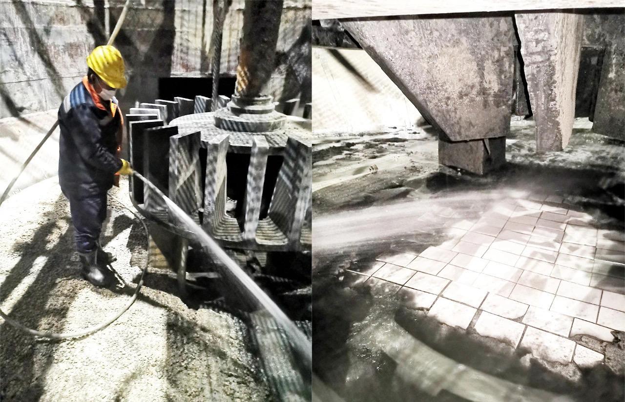 作业人员进入浮选槽内,使用铁锹、水管、水桶等工具清理底部沉积泥沙,确保能够直观地检查耐磨陶瓷层磨损情况。“槽底闷热的环境,厚厚的泥沙,不明的光线,没有影响到作业人员的工作热情。”