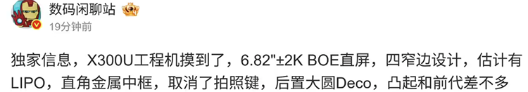 12月30日消息,继X300系列正式发布后,vivo高端旗舰新动向再引关注。博主数码闲聊站今日曝光vivo X300 Ultra工程机核心参数。预计这款超大杯将会搭载6.82英寸的2K BOE直屏,并且首次取消鸡肋的实体拍照键股票金融配资,用上了直角金属中框,大概率还会采用LIPO封装工艺。