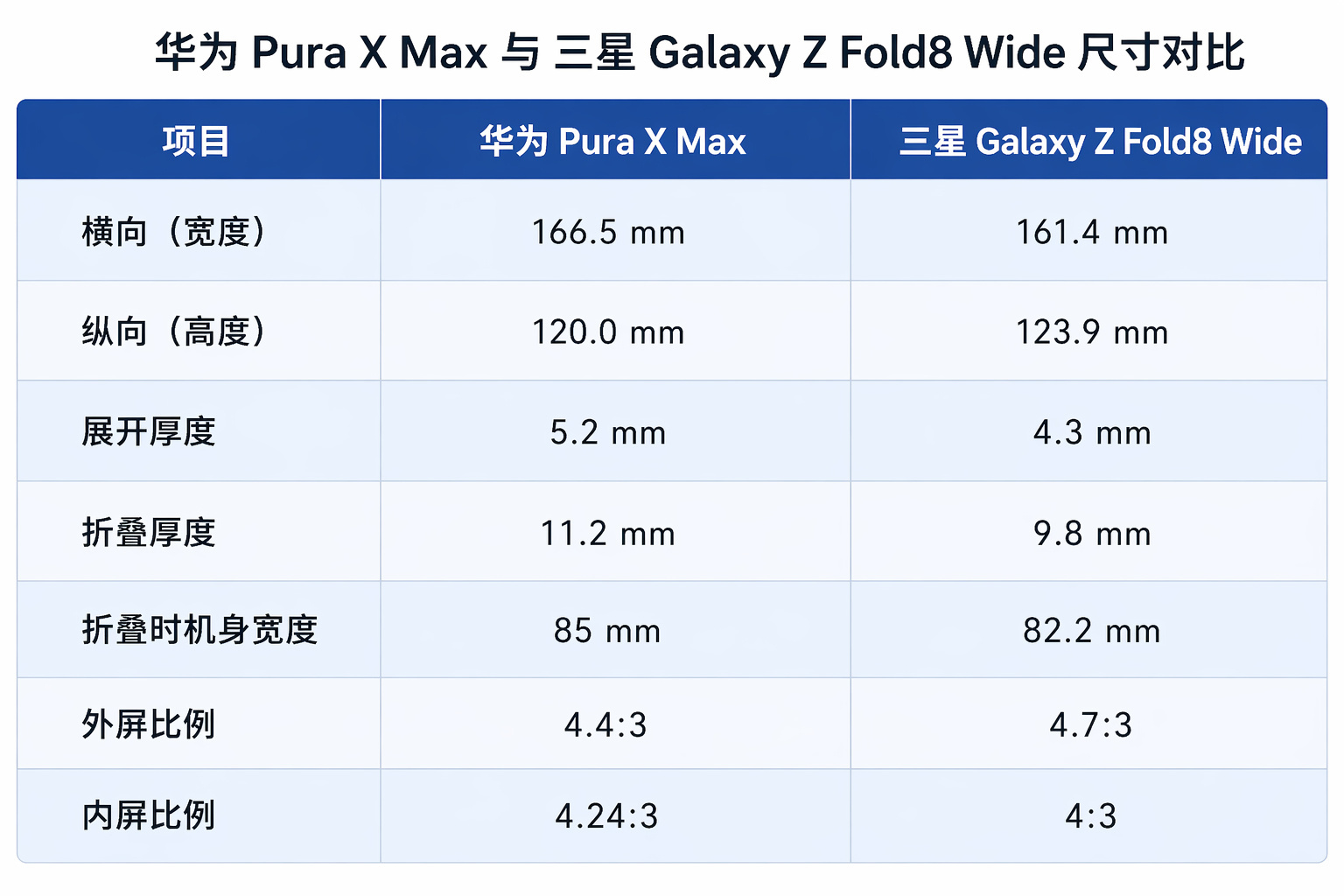 基于官方数据对比,华为 Pura X Max 和三星 Galaxy Z Fold8 Wide 大小对比。
