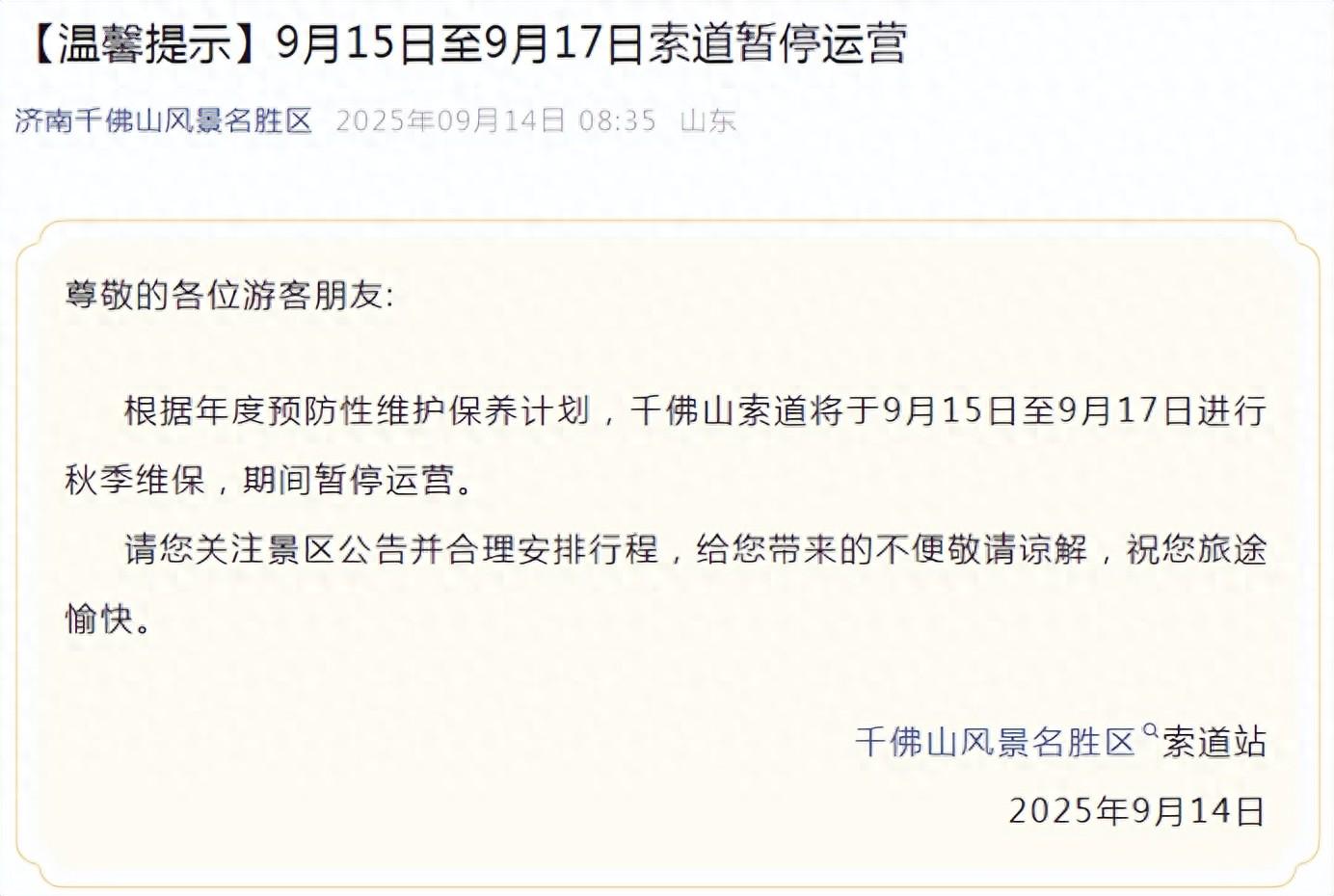 据“济南千佛山风景名胜区”公众号消息,9月15日至9月17日股票金融配资,济南千佛山索道将进行秋季维保,期间暂停运营。